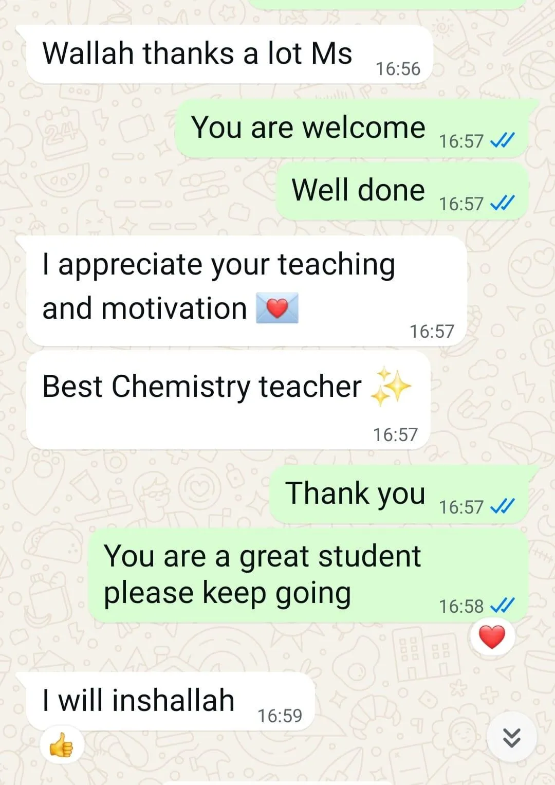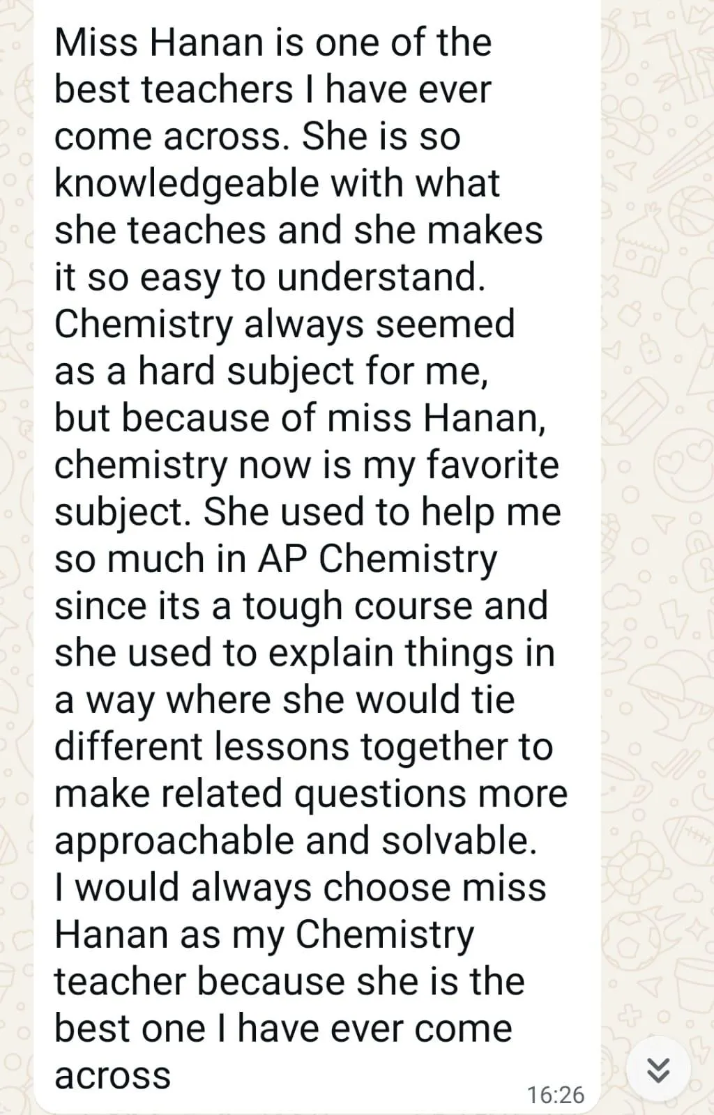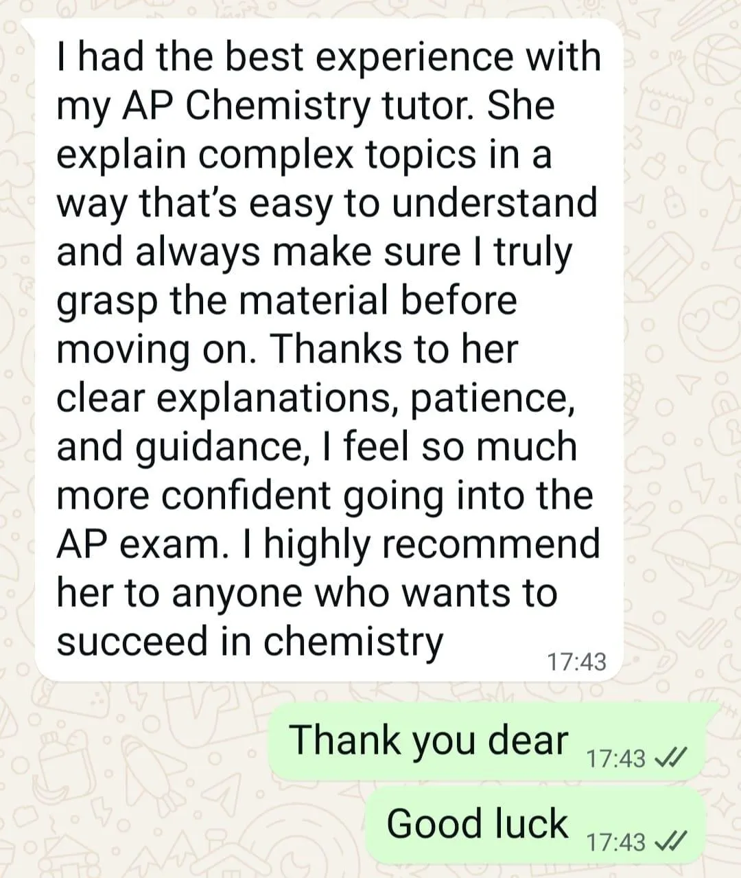 I have been a dedicated chemistry educator since 2012. With over a decade of experience, I specialize in teaching General Chemistry, AP Chemistry, and Foundation Year Chemistry. My approach focuses on building a strong foundation, boosting confidence, and ensuring that every student has the tools they need to excel in their exams and beyond. My goal is to help you not only succeed but truly understand chemistry so that you can apply your knowledge with ease and excitement. Let’s embark on this journey to chemistry success together.
